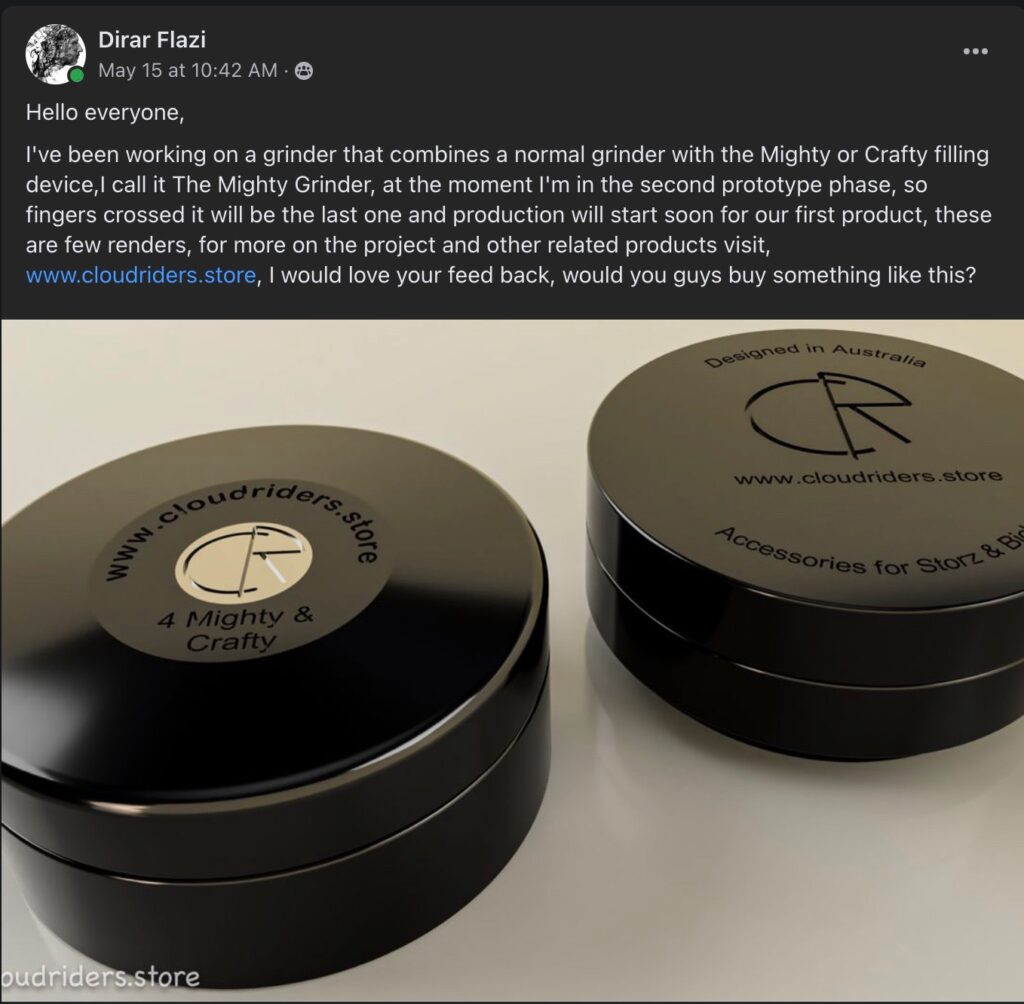 Hello, and welcome to Cloud Riders Store, where I design, manufacture and sell accessories for Storz & Bickel Vaporisers (source manufacture). At the moment I’m working on few projects, the Mighty Grinder is the main one. It’s a Grinder that fits on the Mighty & Crafty vaporiser, using a similar filling aid device so you can grind right into it and savour every trichome. Also I’m in the middle of moving from Melbourne to the Netherlands and I’m almost finished designing and testing a Charging Stand for the Mighty.